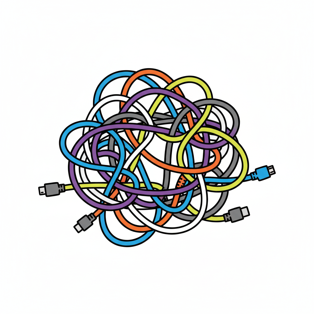 Illustration eines verworrenen Kabelsalats aus bunten Kabeln mit Steckern auf weißem Hintergrund.
