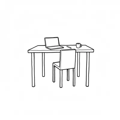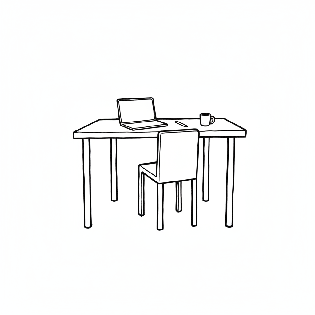 Ein einfacher Tisch mit Laptop, Stuhl und Kaffeetasse.
