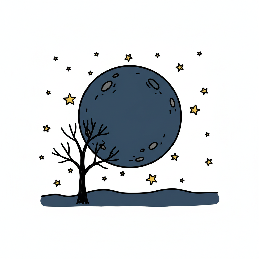 Handgezeichnete Nachtszene mit großem, dunklem Mond, kahlem Baum und vielen Sternen.