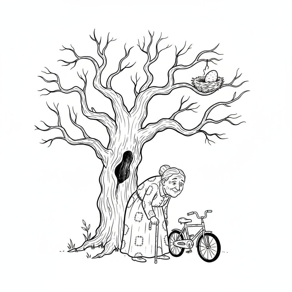 Eine alte Frau mit Stock und Fahrrad steht unter einem kahlen Baum mit Vogelnest.