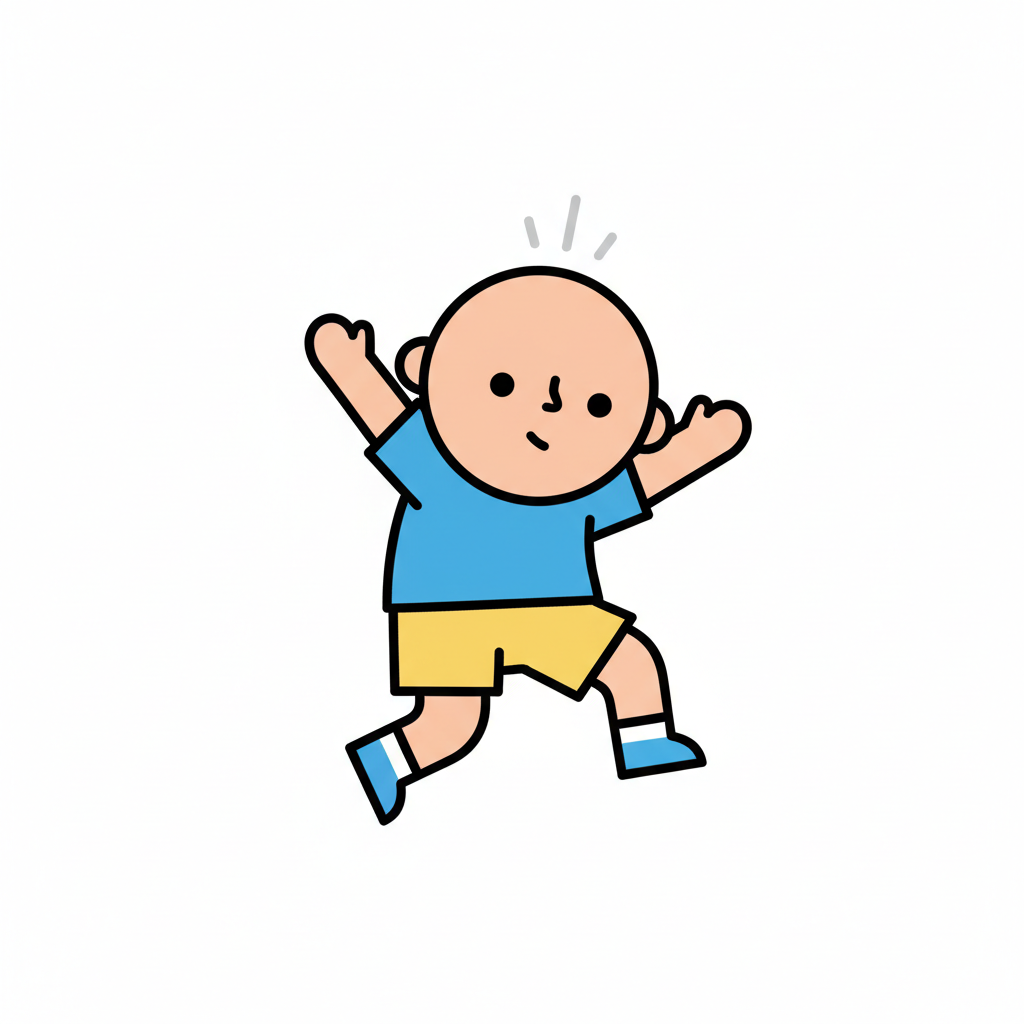 Ein fröhliches, kahlköpfiges Cartoon-Baby in blauer Kleidung springt mit erhobenen Armen.