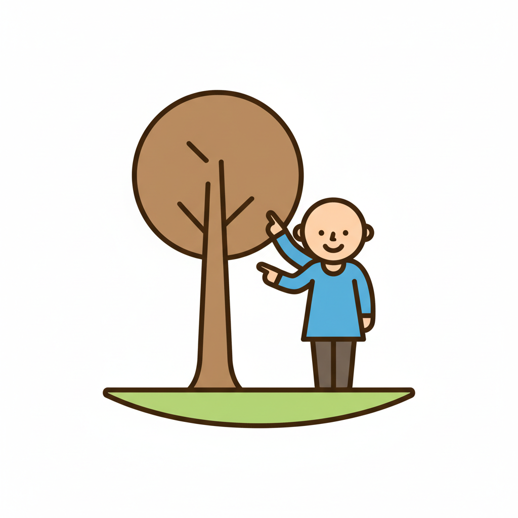 Stilisierte Illustration einer Person, die mit beiden Händen auf einen Baum auf grünem Boden zeigt.