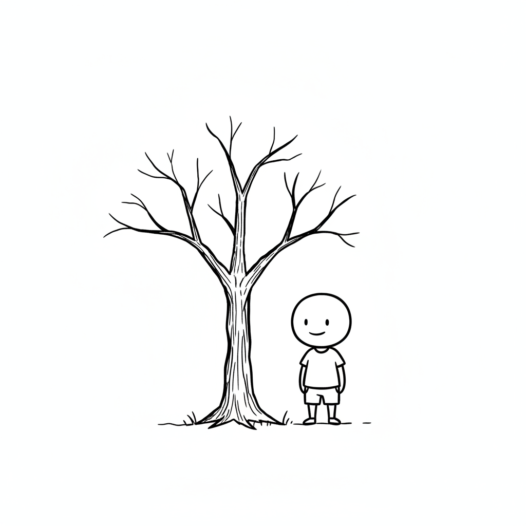 Minimalistische Zeichnung: Ein kahler Baum und eine lächelnde Figur stehen nebeneinander.