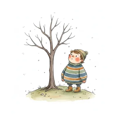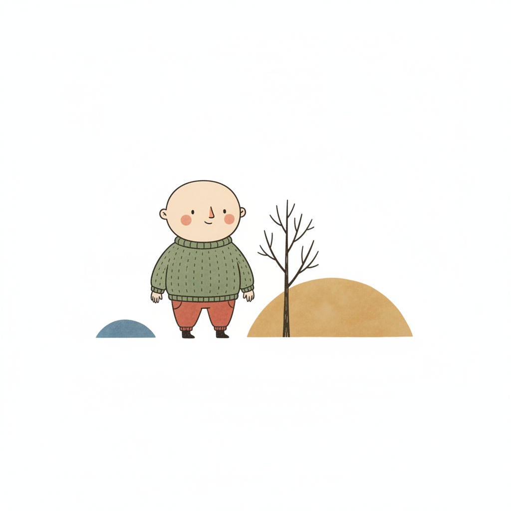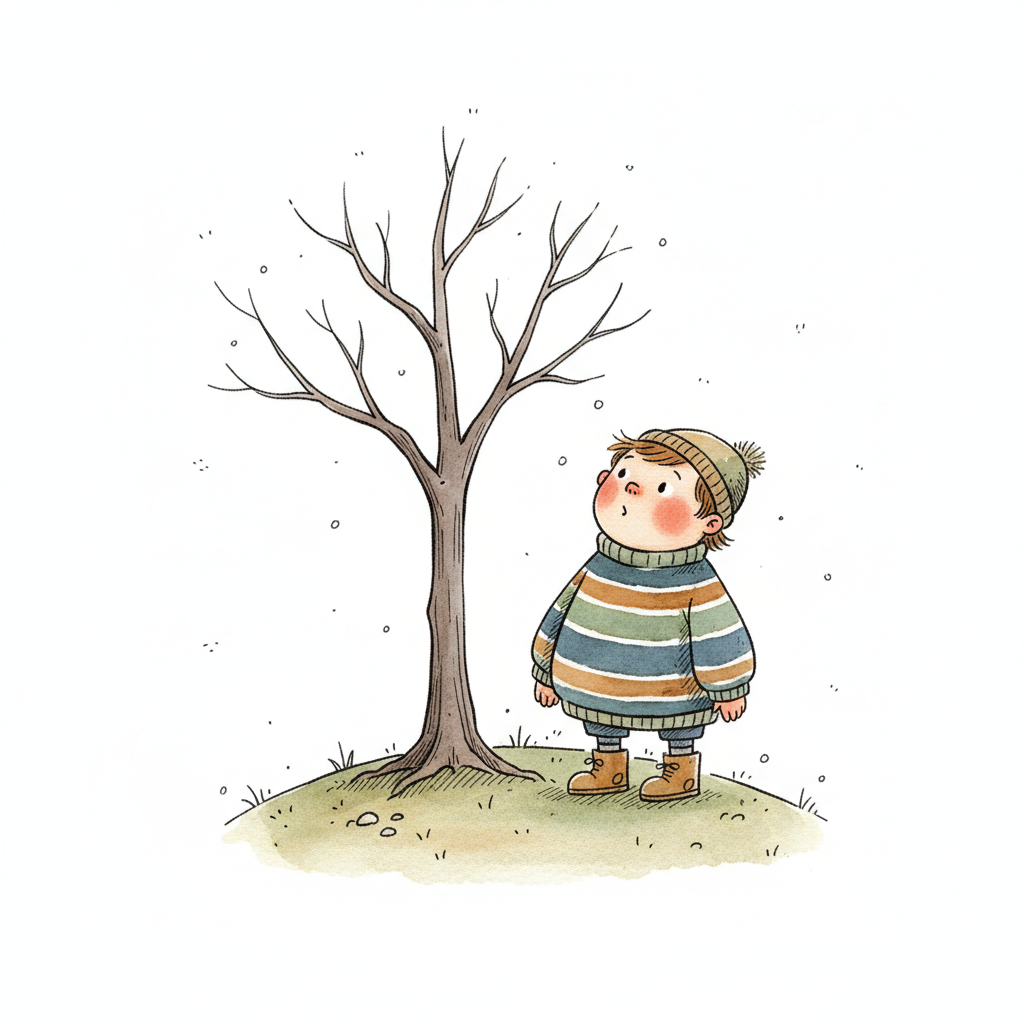 Niedliche Illustration eines kahlköpfigen Kindes in grünem Pullover neben einem kahlen Baum.
