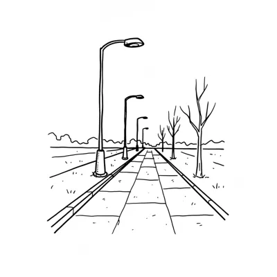 Schwarz-weiße Skizze eines Weges mit Laternen und kahlen Bäumen, der in die Ferne führt.