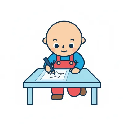 Ein lächelndes, kahles Kind in Latzhose zeichnet einen Stern auf Papier an einem Tisch.