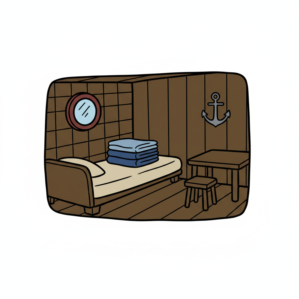 Gemütliche Schiffskajüte im Cartoon-Stil mit Bett, Bullauge, Anker, Tisch und Hocker.