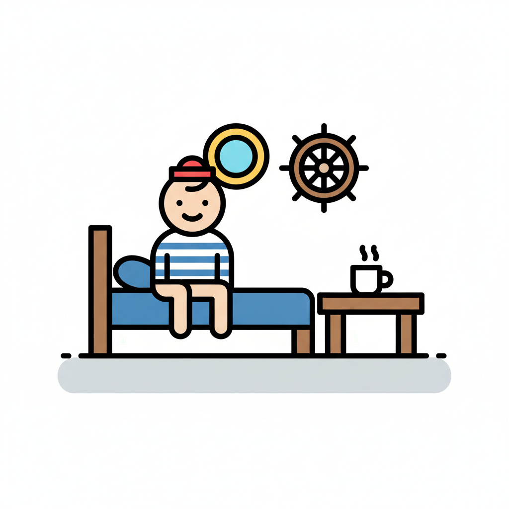 Matrose sitzt auf Bett mit Kaffee, Bullauge und Steuerrad. Maritimes Schlafzimmer-Setup.