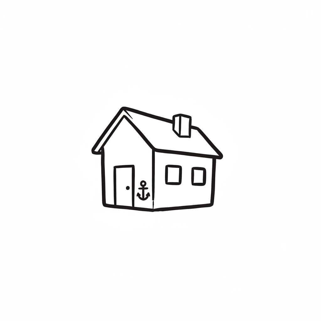 Strichzeichnung eines Hauses mit Anker-Symbol neben der Tür auf weißem Hintergrund.