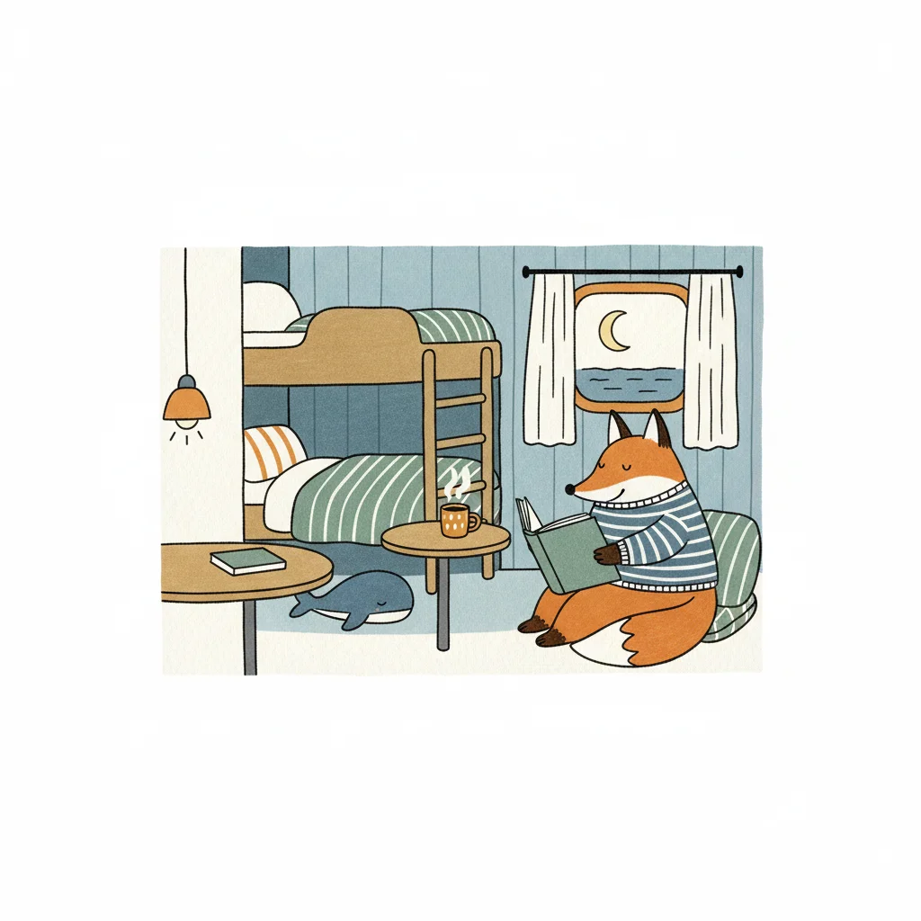 Ein Fuchs liest gemütlich ein Buch in einem Zimmer mit Etagenbett und Meeresblick bei Nacht.