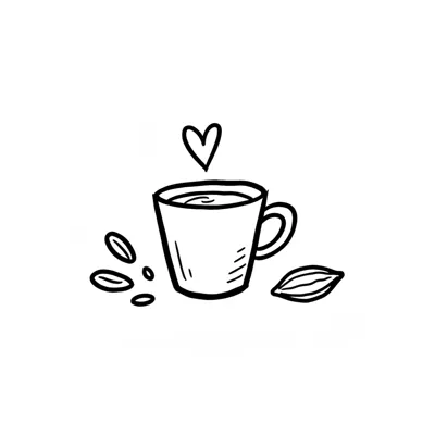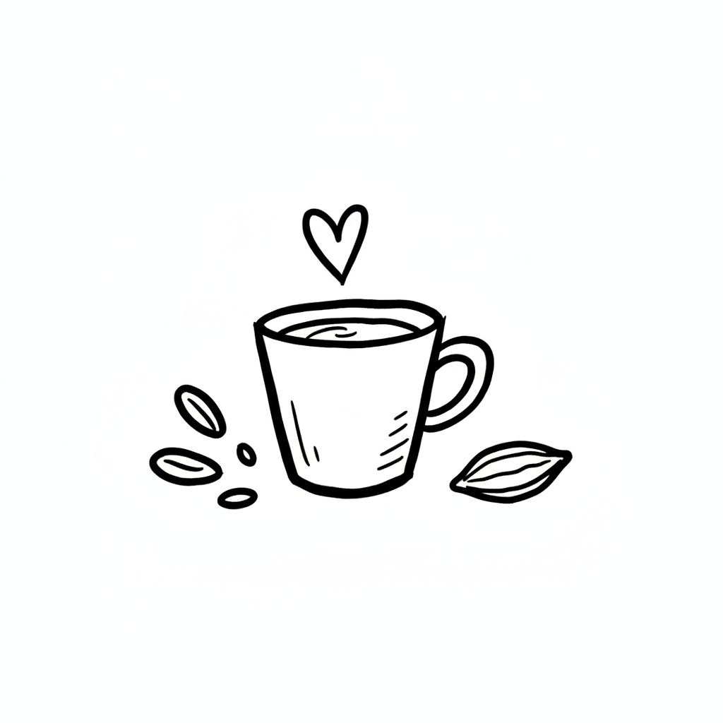 Ein liebevoll gestalteter Kaffeebecher mit Bohnen und einem Blatt.