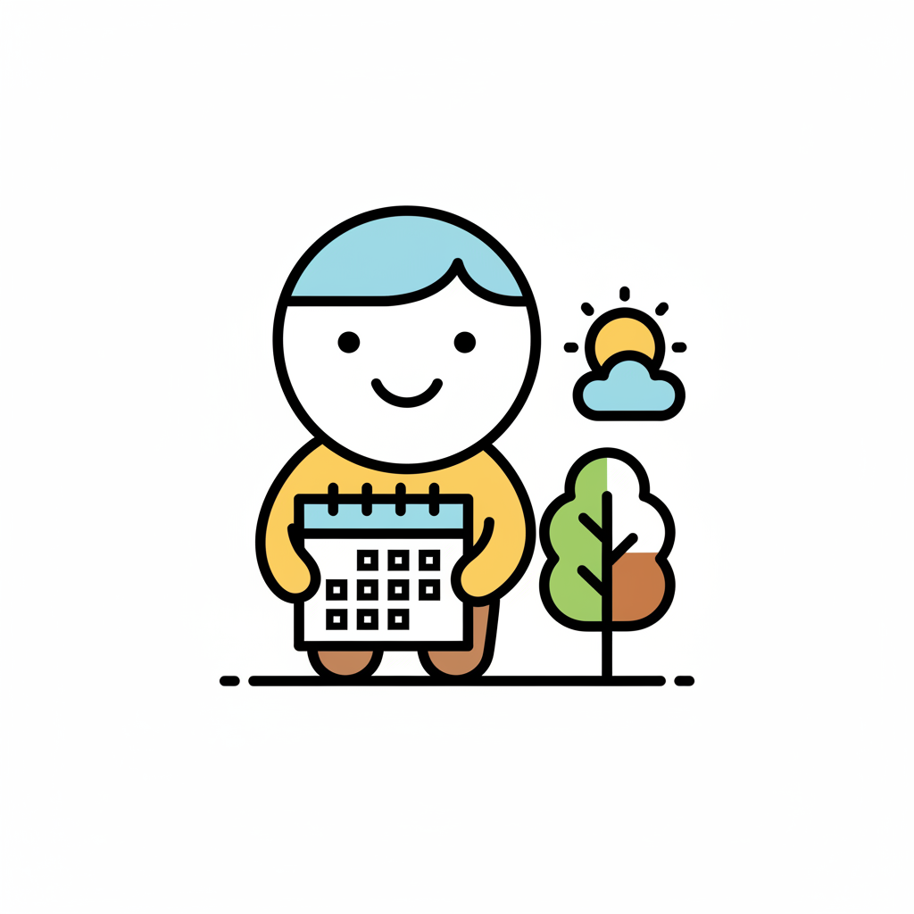 Ein fröhlicher Charakter hält einen Kalender vor einem Baum und Sonne.