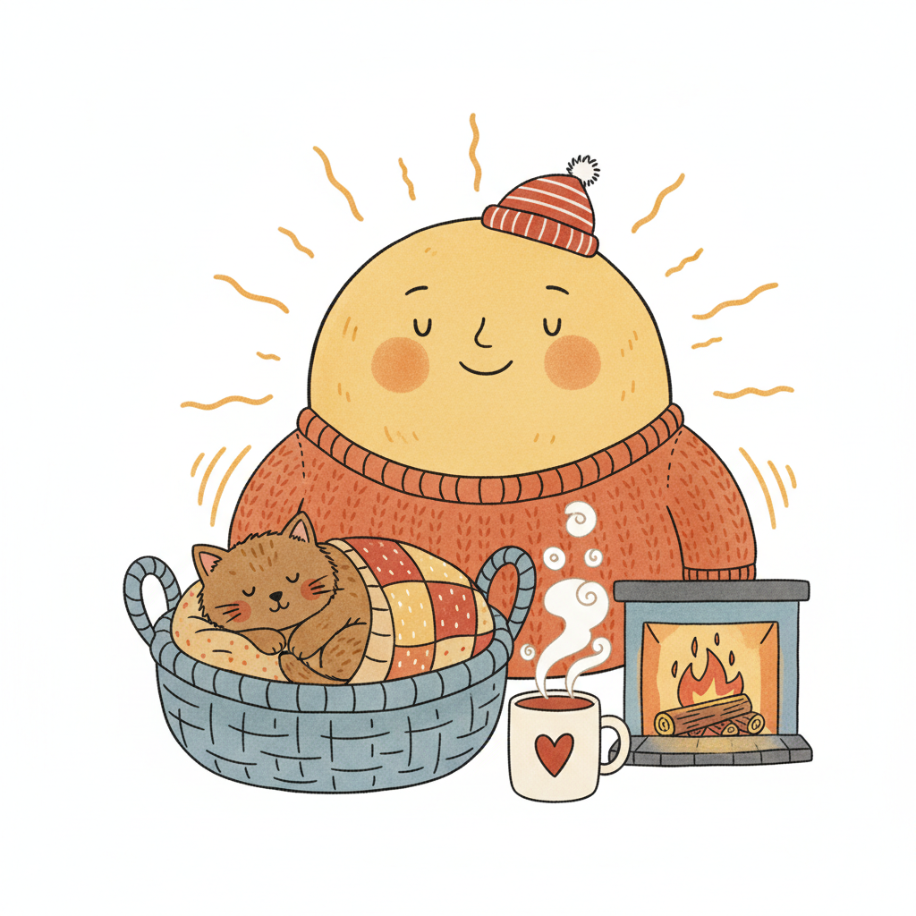 Gemütliche Szene mit lächelndem Charakter, schlafender Katze, heißem Getränk und Kaminfeuer.