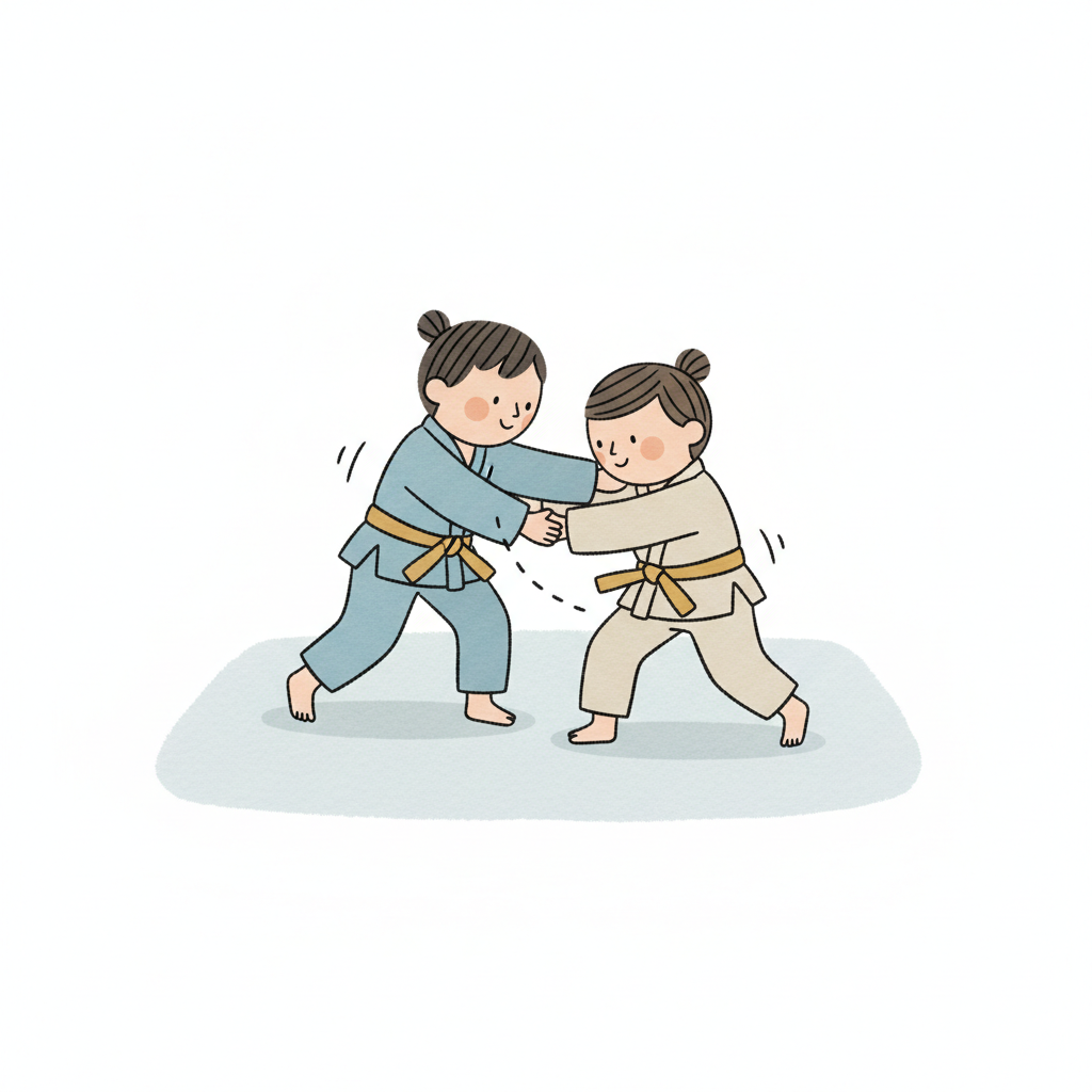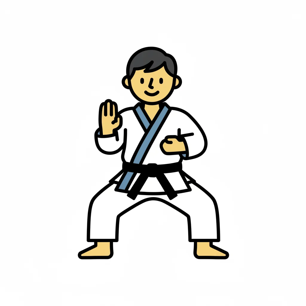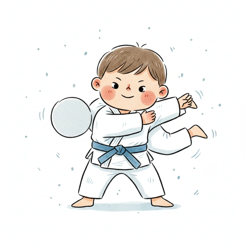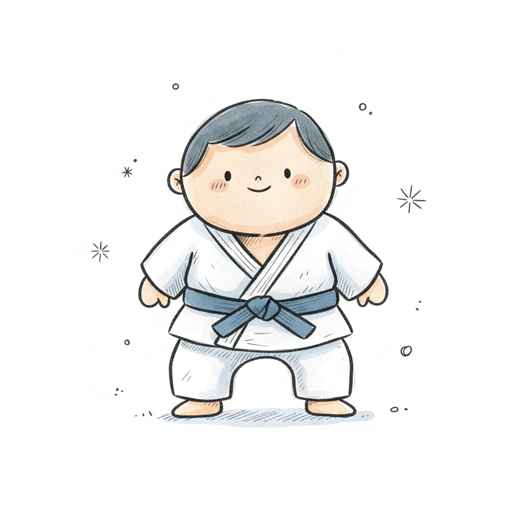Niedliches Cartoon-Kind in weißem Kampfsportanzug mit blauem Gürtel, lächelt freundlich.