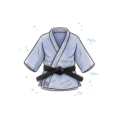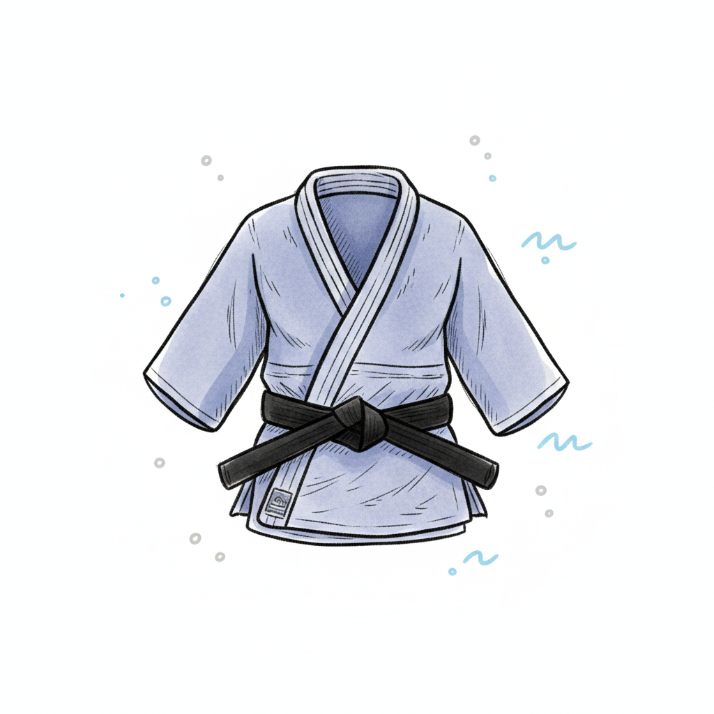 Ein hellblauer Kampfkunst-Gi mit schwarzem Gürtel, illustriert im Cartoon-Stil auf weißem Grund.