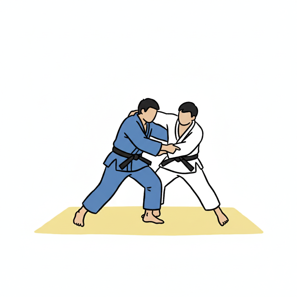 Schwarz-weiße Illustration von zwei Judoka in Kampfanzügen, die eine Wurftechnik ausführen.