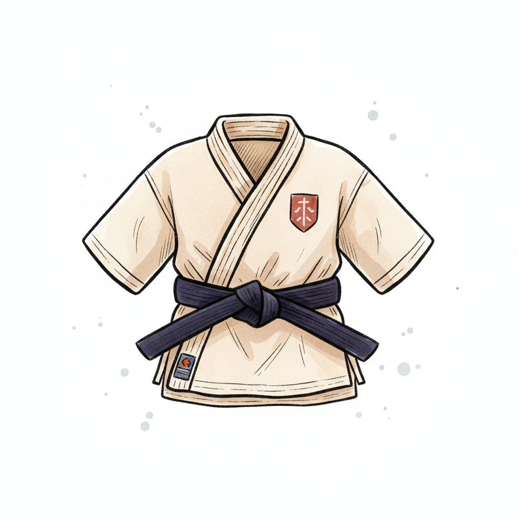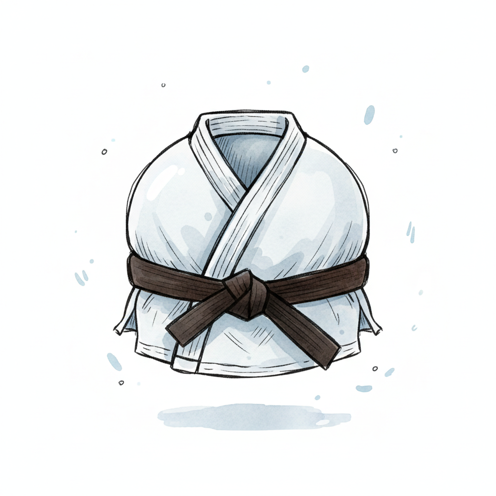 Illustriertes weißes Kampfsport-Gi mit braunem Gürtel, schwebend auf weißem Hintergrund.