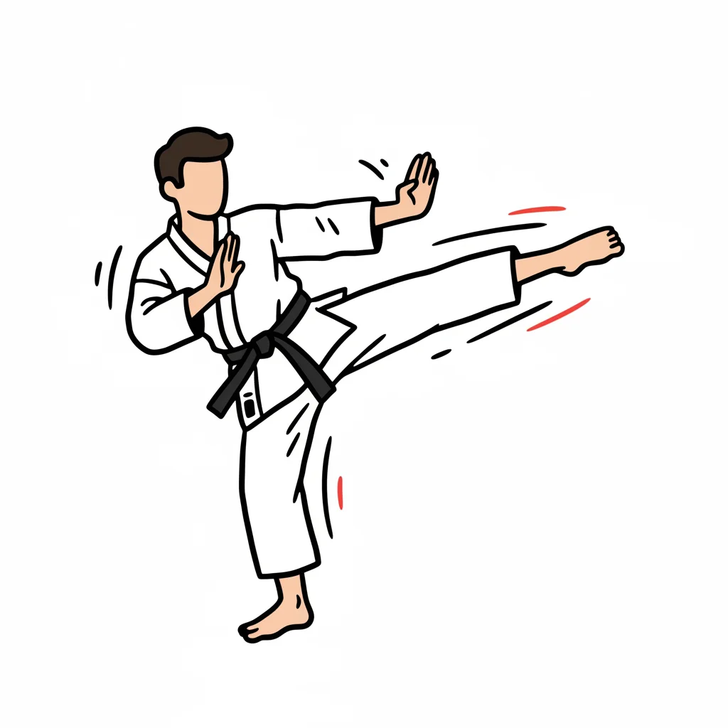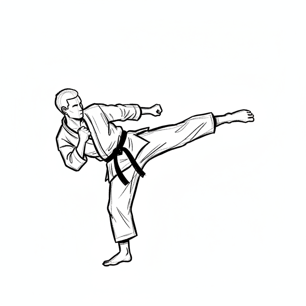 Schwarz-weiß-Illustration eines Kampfsportlers im Gi mit schwarzem Gürtel, der einen Tritt ausführt.