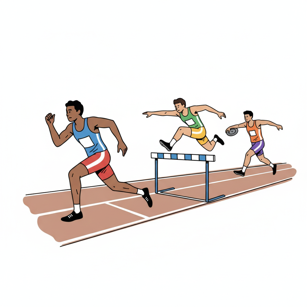 Drei Athleten auf einer Laufbahn: einer rennt, einer springt über eine Hürde, einer wirft einen Diskus.