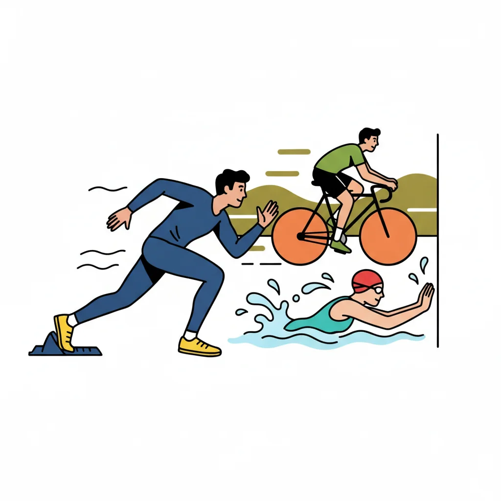Illustration eines Triathlons mit Läufer, Radfahrer und Schwimmer in Aktion.