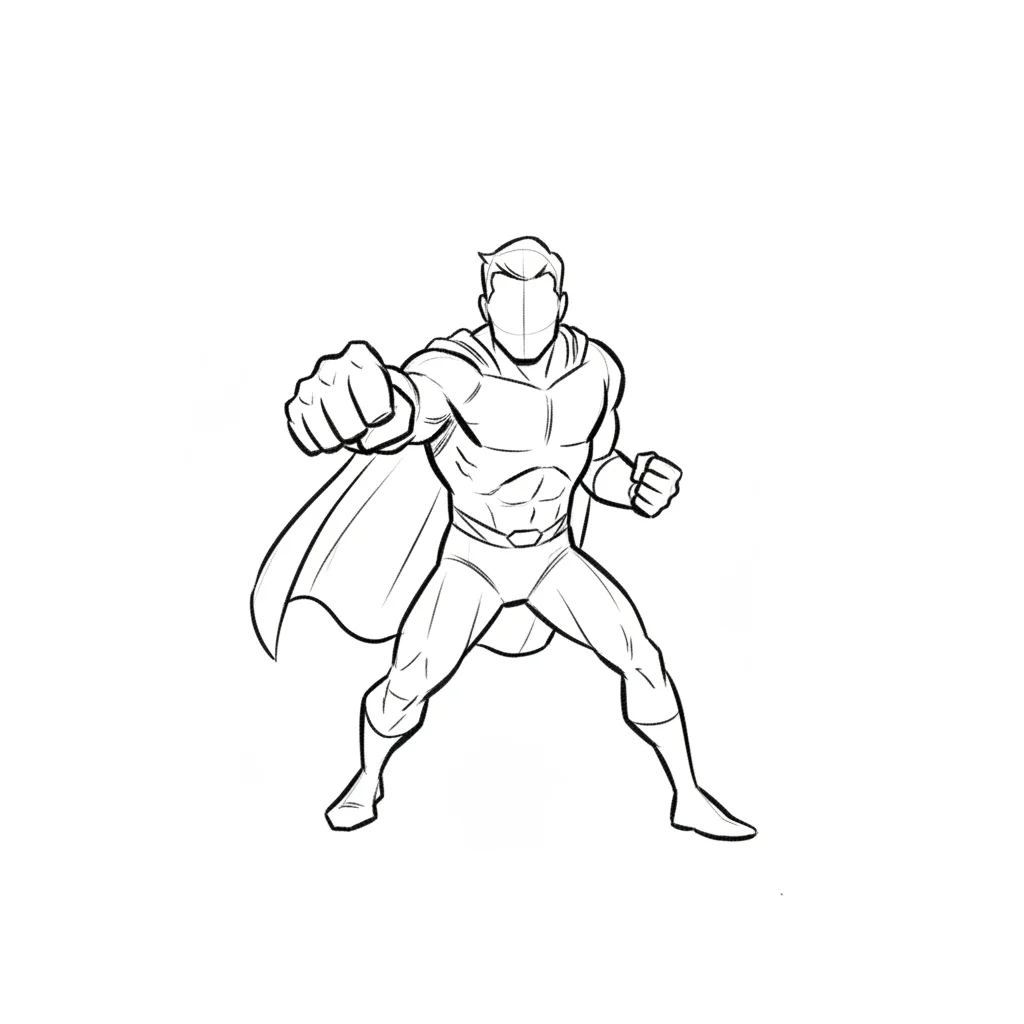 Strichzeichnung eines Superhelden mit Umhang in Kampfpose, bereit zum Schlag.