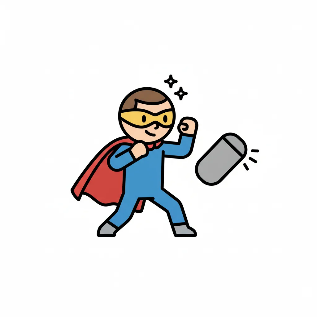 Cartoon-Superheld in Kampfpose wehrt eine Pille ab, symbolisiert Stärke und Abwehr.
