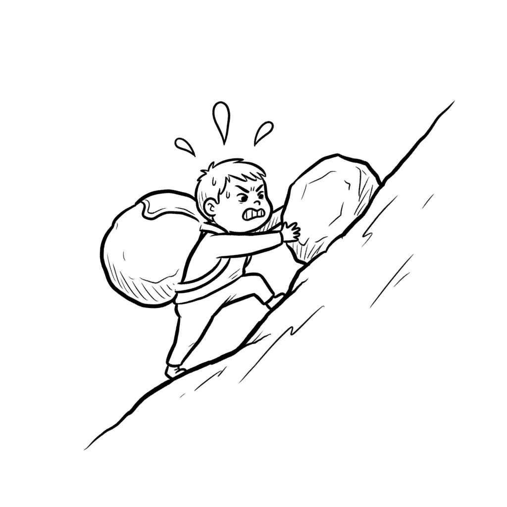 Müder Junge schiebt einen Stein einen steilen Berg hinauf, mit schwerem Sack auf dem Rücken.