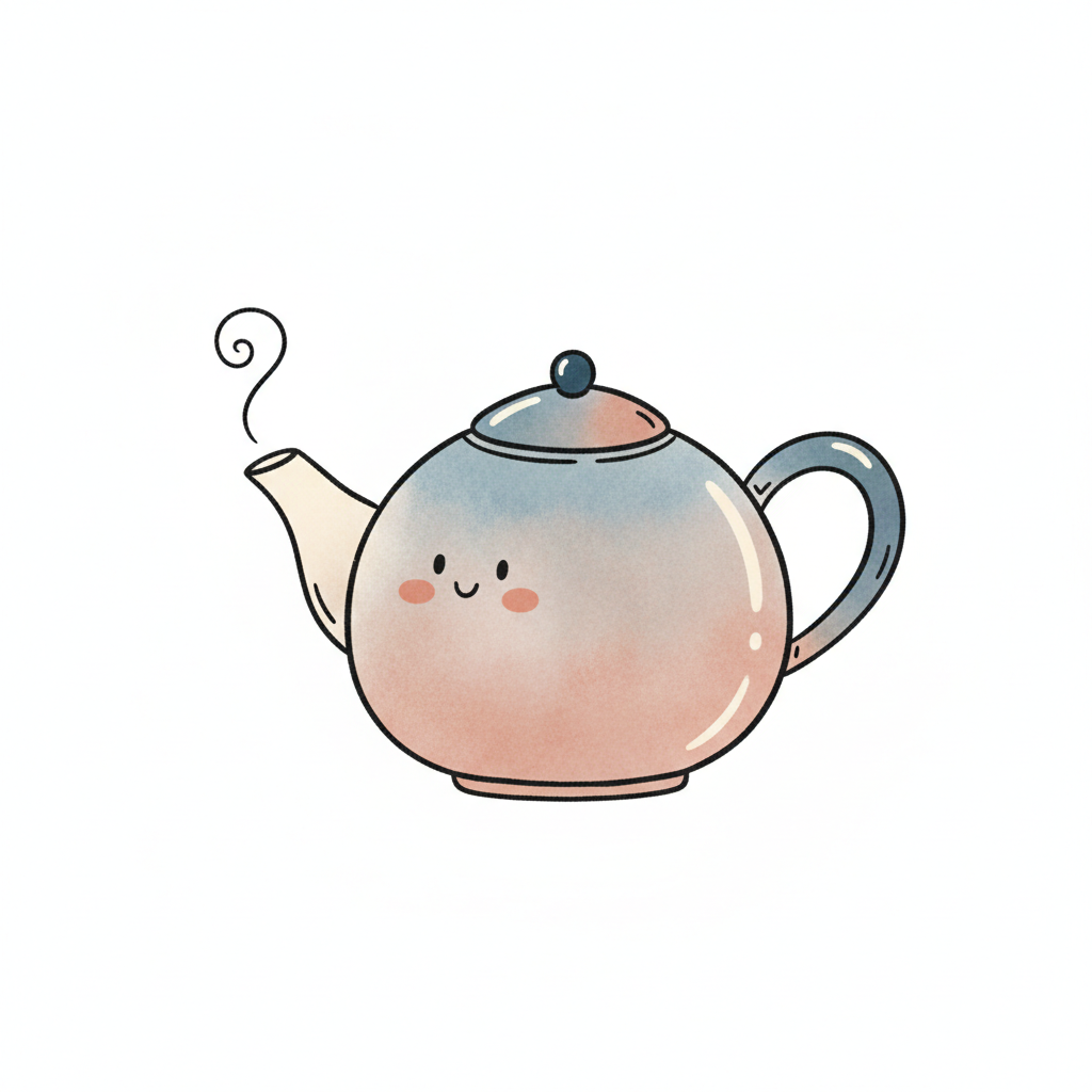 Bunte Teekanne mit einem lächelnden Gesicht und Rauchzeichen.