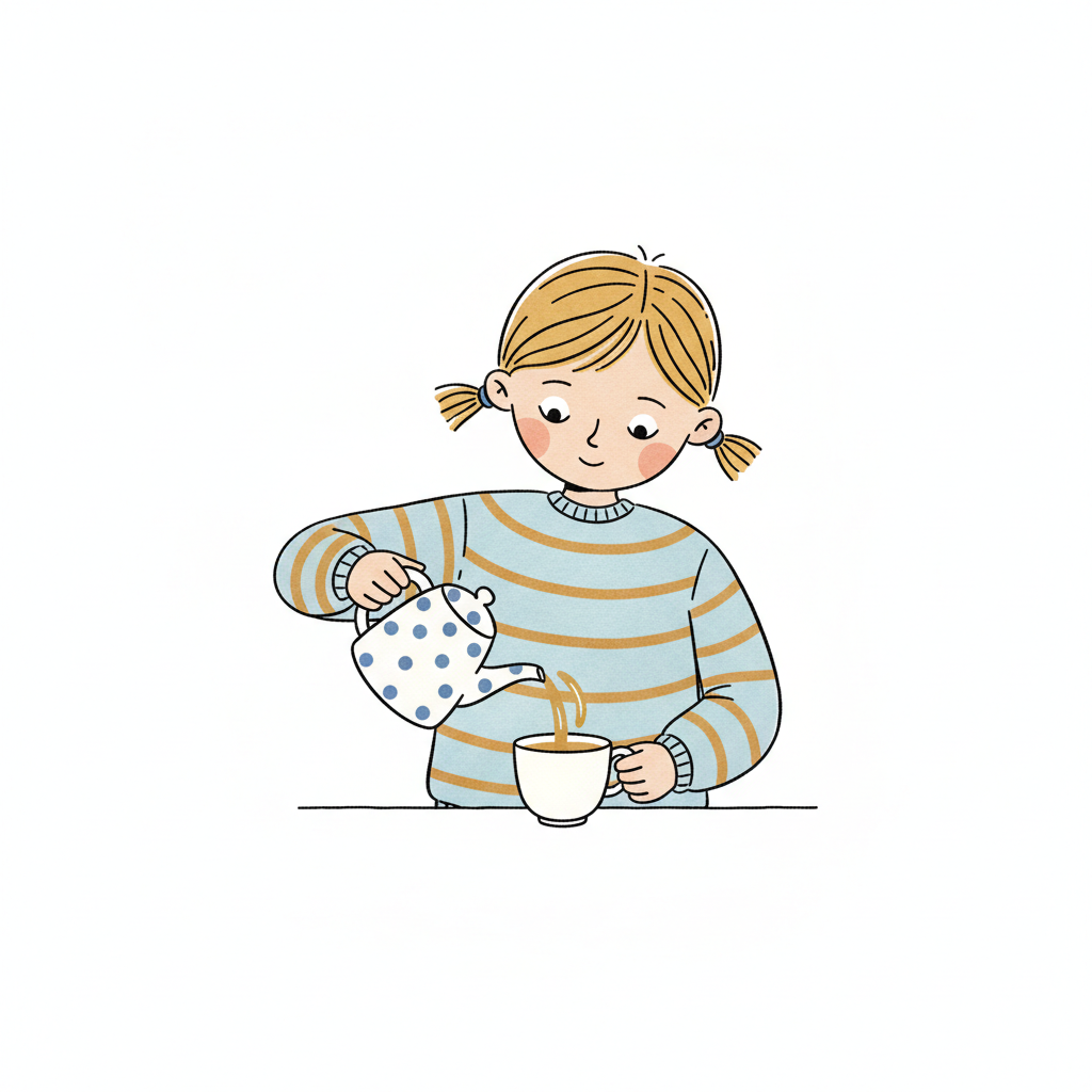 Ein Mädchen gießt Tee aus einer Kanne in eine Tasse.