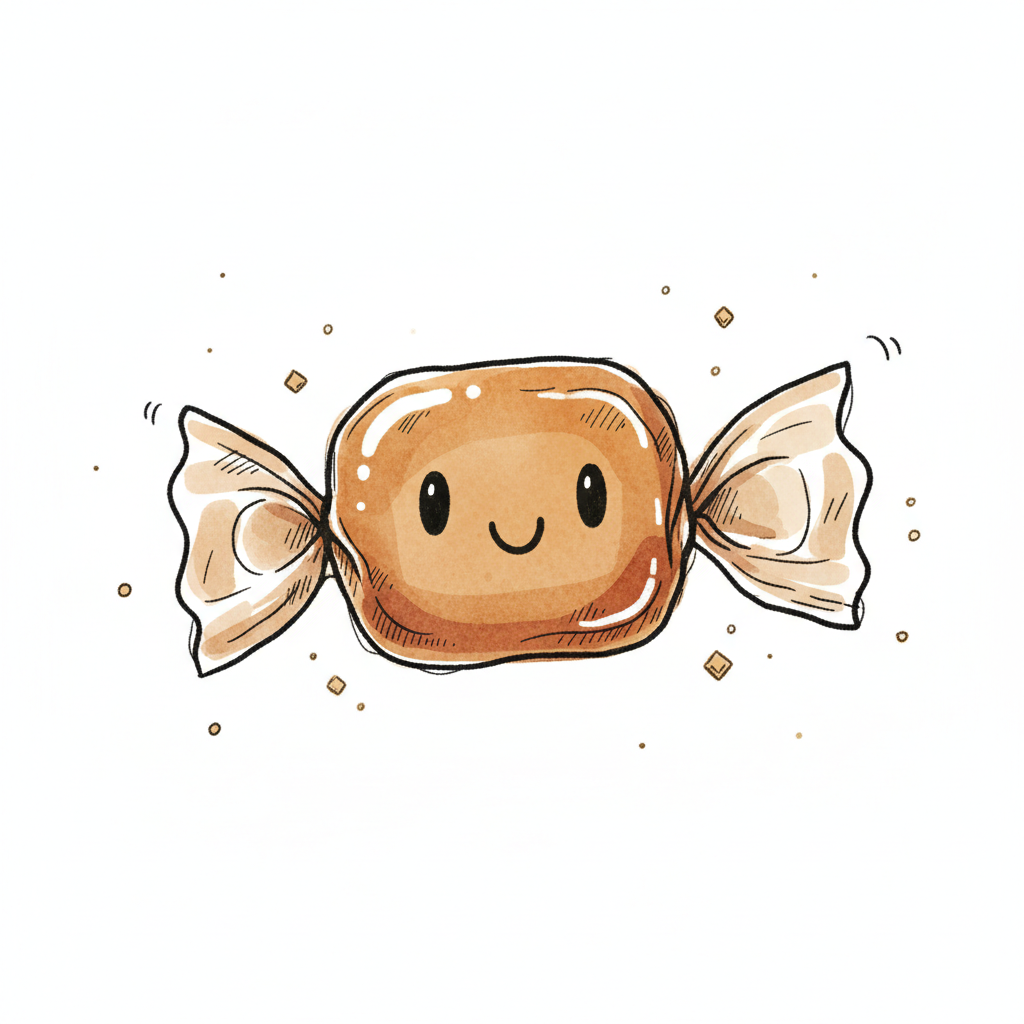 Aquarell-Illustration eines eingewickelten Karamellbonbons auf weißem Hintergrund mit leichten Sprenkeln.