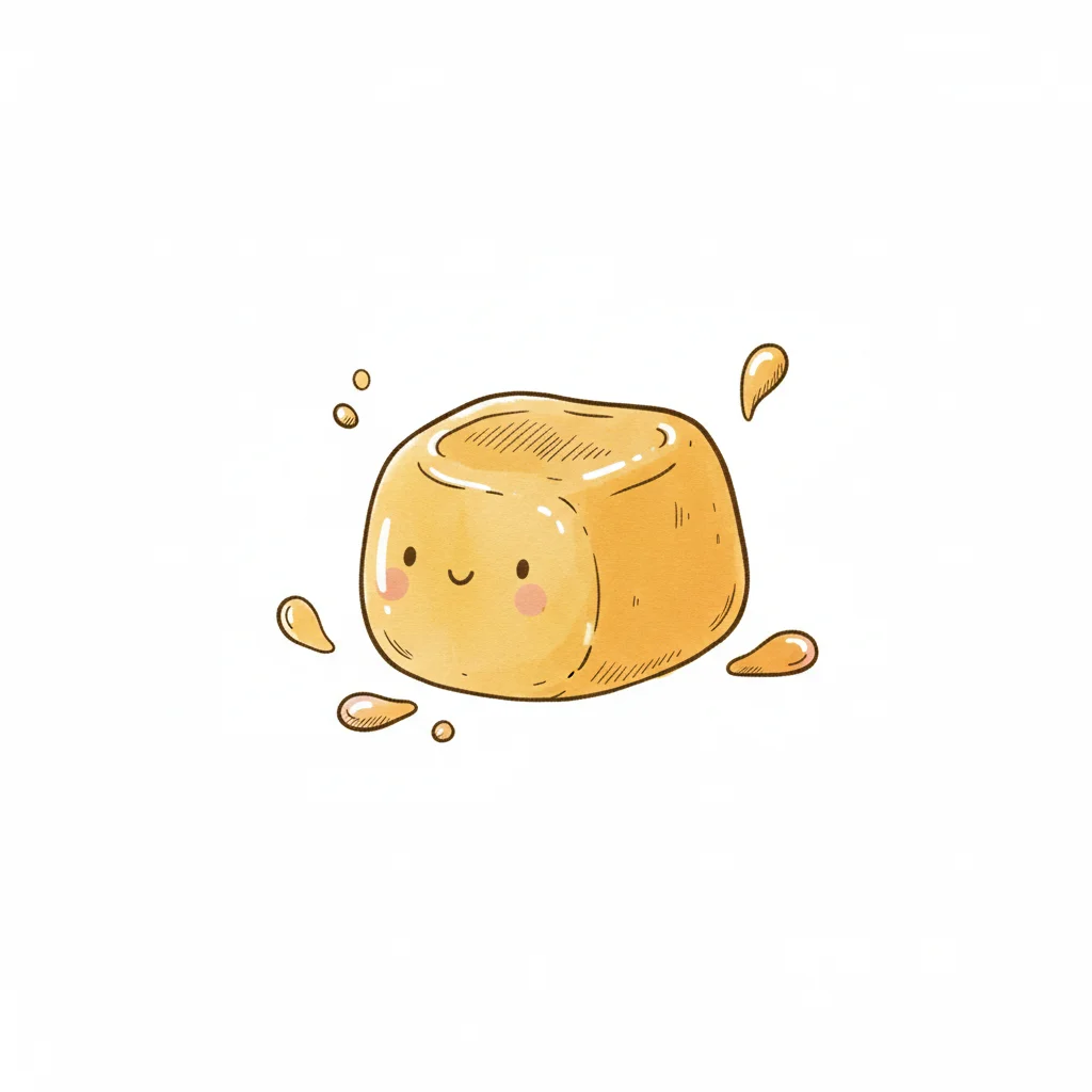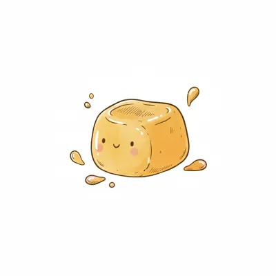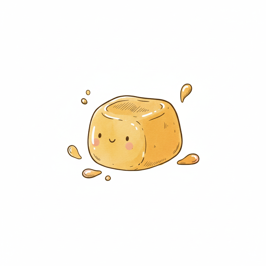 Niedlicher, lächelnder Karamellwürfel im Cartoon-Stil mit kleinen Spritzern.