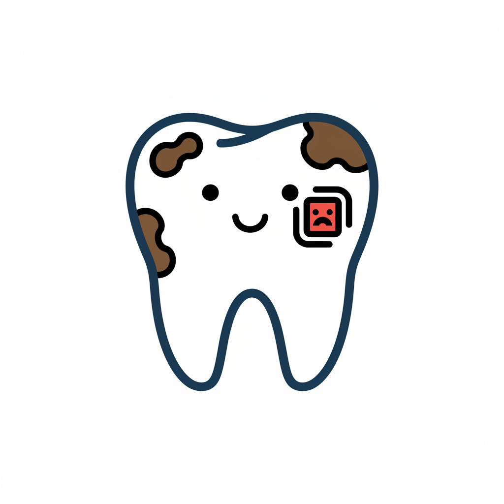 Niedlicher Cartoon-Zahn mit Kariesflecken und einem Schmerzsymbol, der dennoch lächelt.