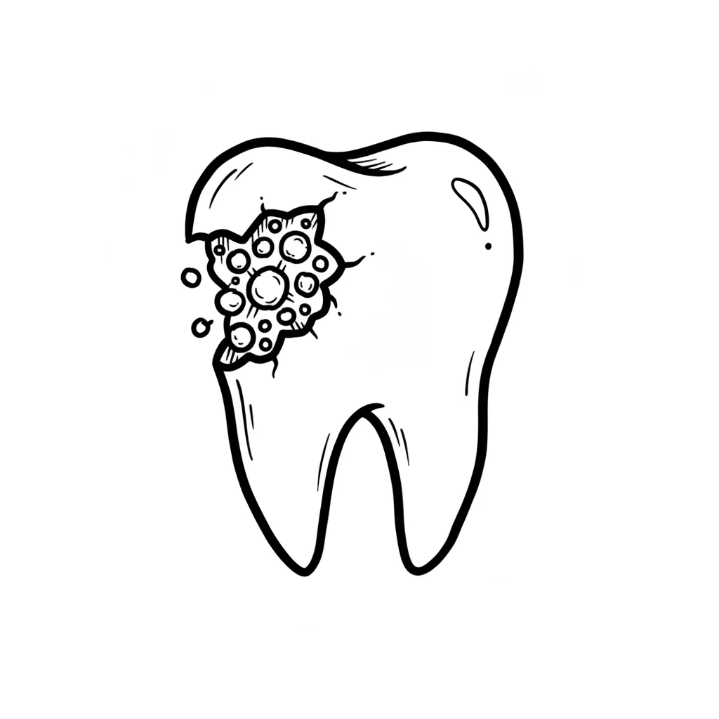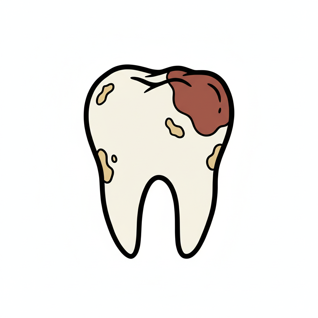 Cartoon-Darstellung eines Zahns mit Karies und Verfärbungen, der Zahnschäden zeigt.