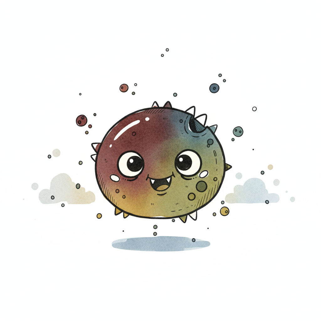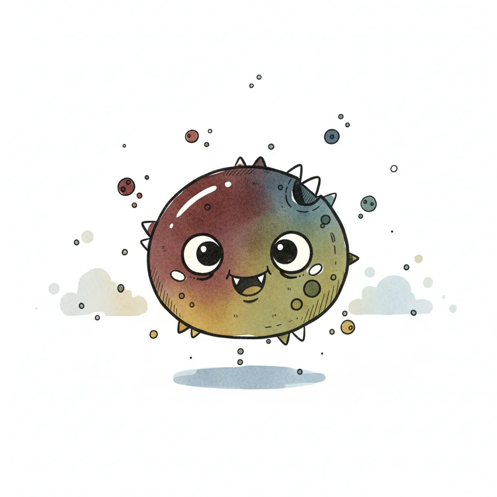 Niedliches, rundes, buntes Monster mit großen Augen und Stacheln, das fröhlich schwebt.