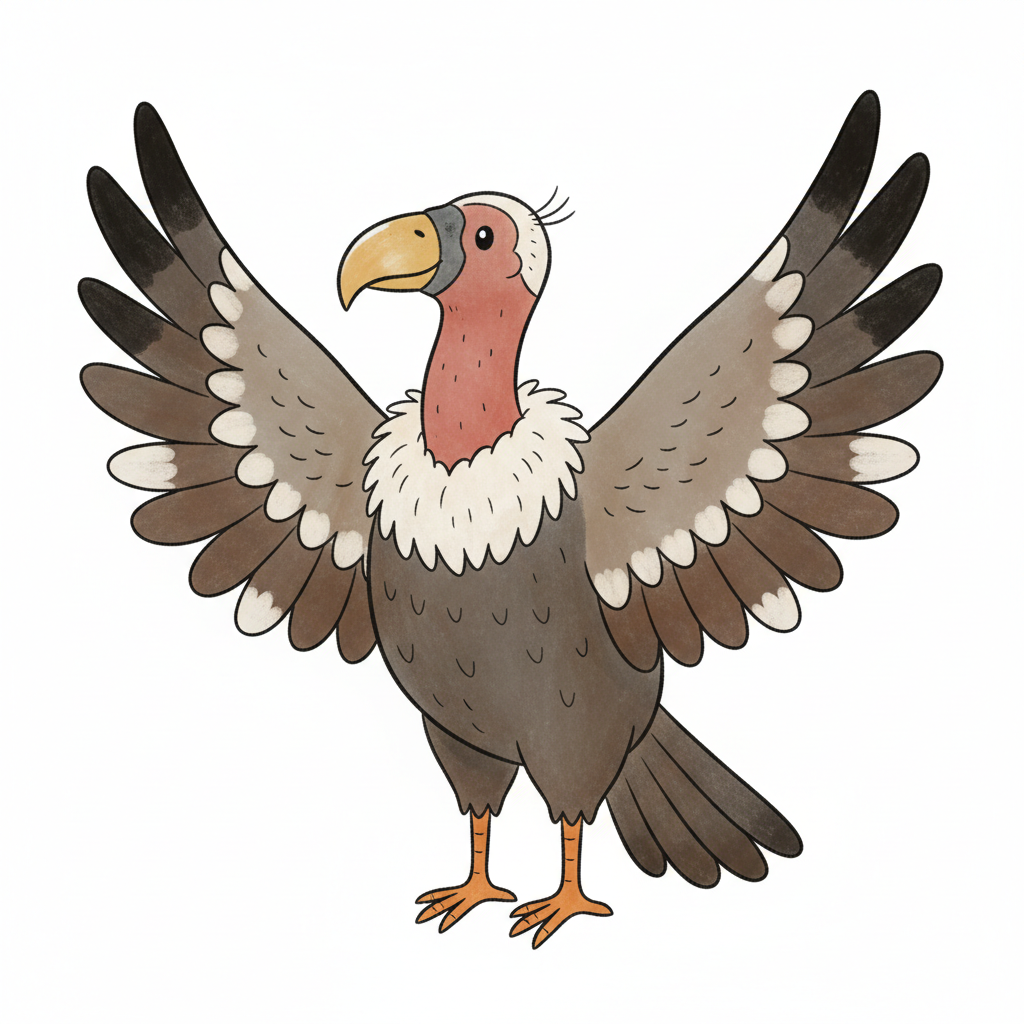 Ein cartoonartiger Geier mit ausgebreiteten Flügeln und freundlichem Gesicht.