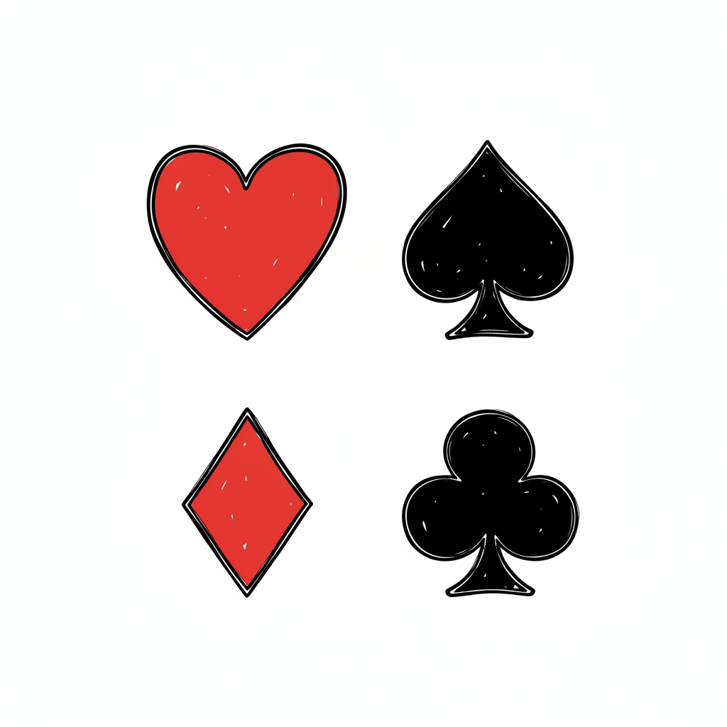 Vier handgezeichnete Spielkartensymbole: Herz, Pik, Karo und Kreuz in Rot und Schwarz.