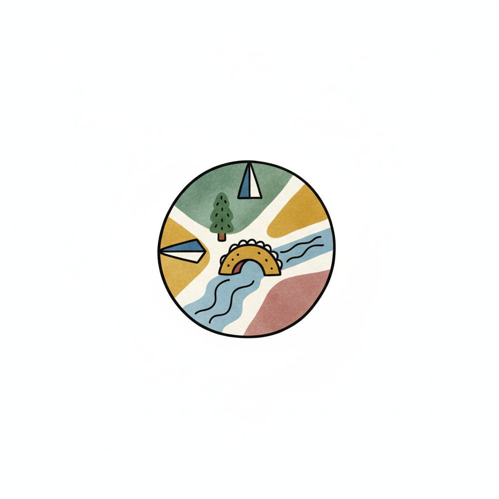 Kreisförmige Illustration einer stilisierten Landschaft mit Fluss, Brücke und Baum in sanften Farben.