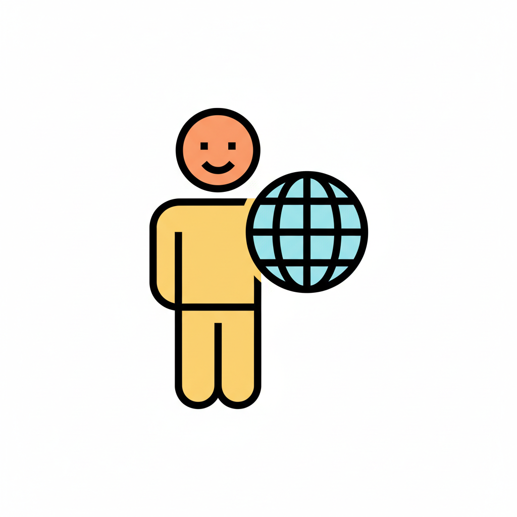 Stilisierte Person mit lächelndem Gesicht hält einen Globus. Symbol für globale Verbindung.