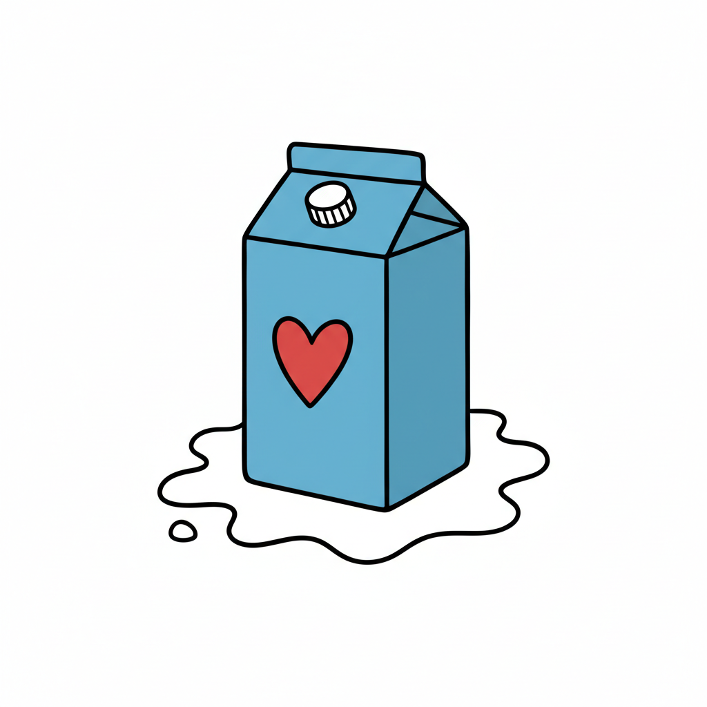 Eine Milchkarton mit einem roten Herz und verschütteter Milch.