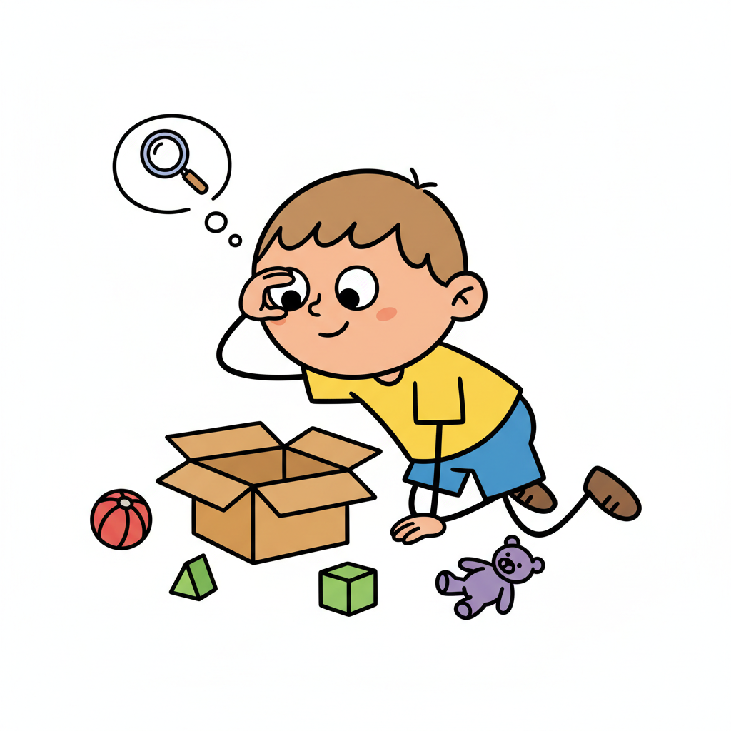 Ein Junge schaut neugierig in einen Karton voller Spielsachen.