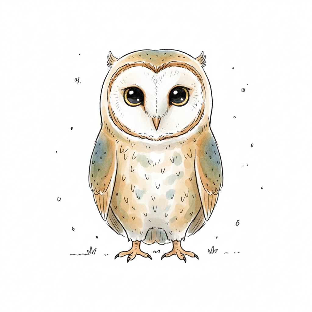 Eine niedliche, handgezeichnete Eule steht aufrecht mit großen Augen.