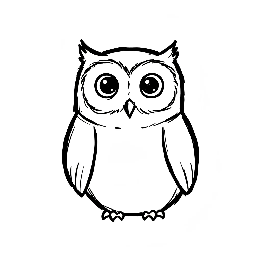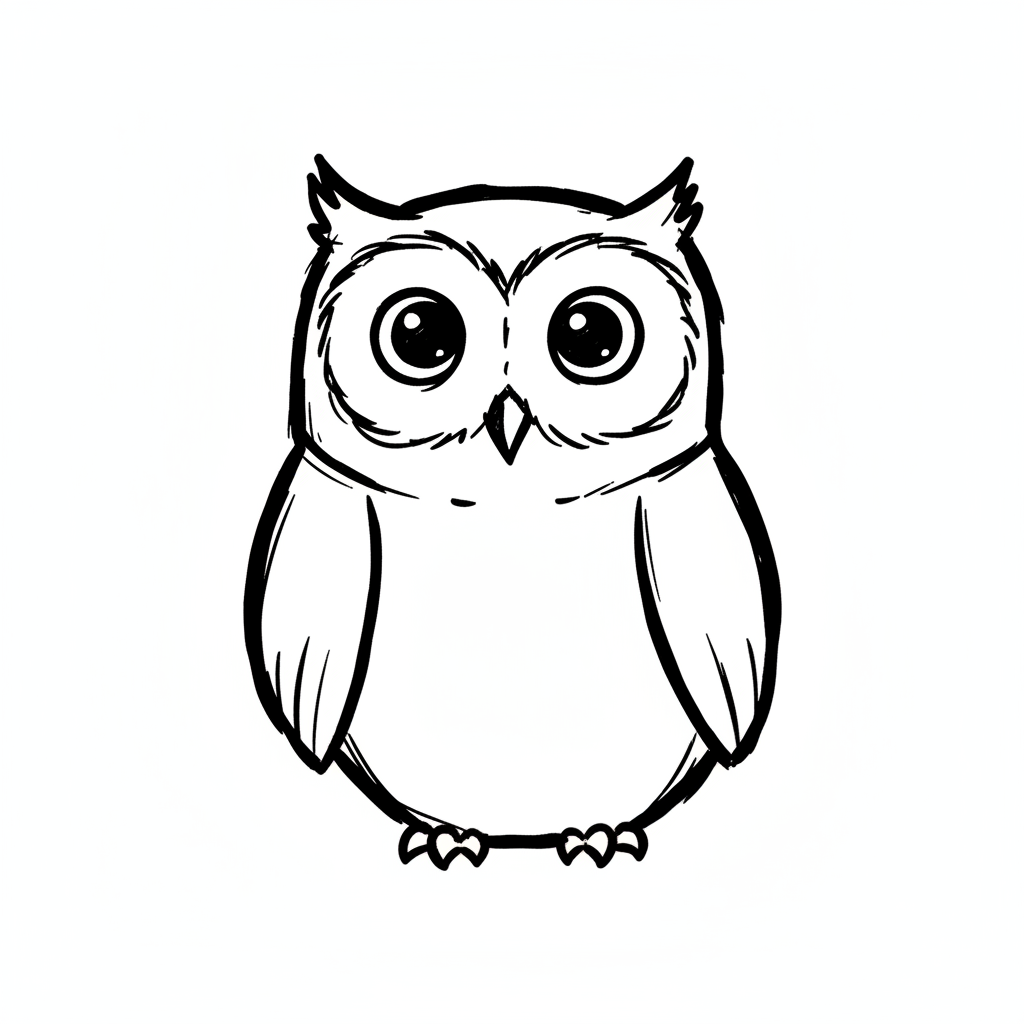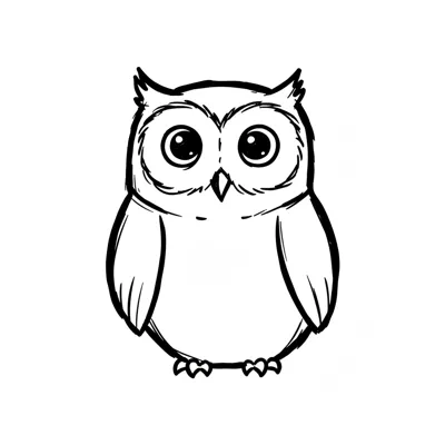 Eine einfache, zeichnerische Darstellung einer Eule mit großen Augen.