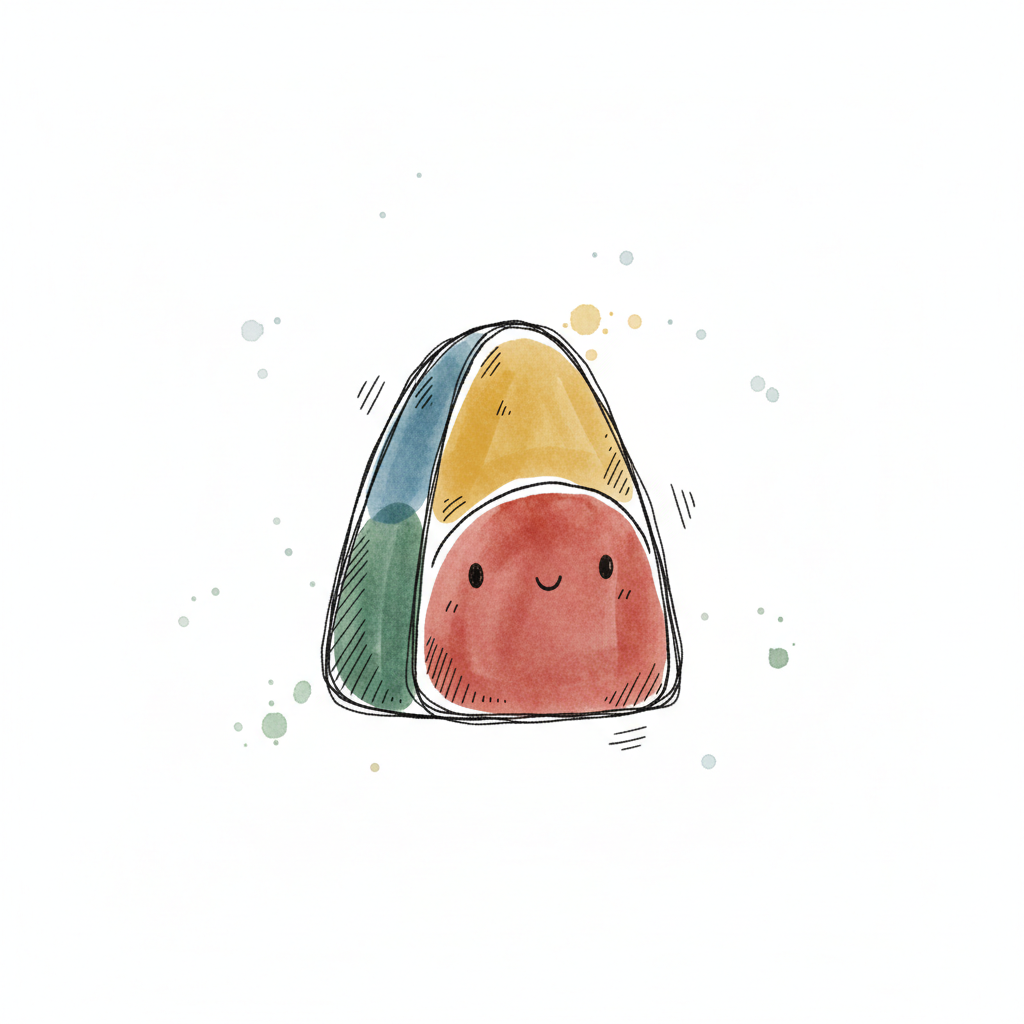 Niedlicher, lächelnder Onigiri in Aquarellfarben mit bunten Hüllen und Farbspritzern.