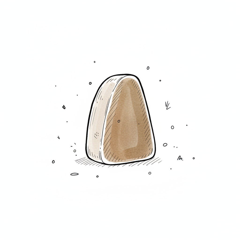 Eine stilisierte, braune, dreieckige Form, die wie ein Stein oder ein Bonbon aussieht, auf weißem Grund.