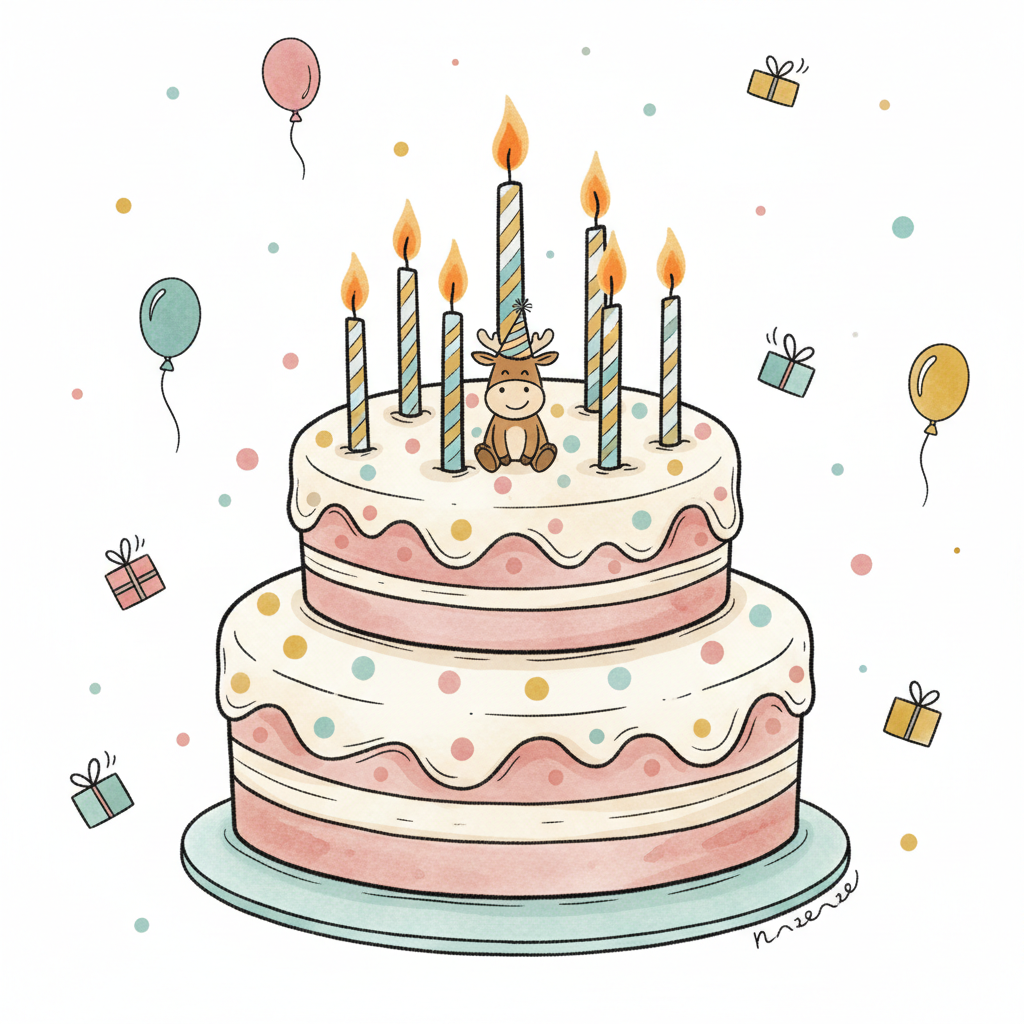 Ein zweistöckiger Geburtstagskuchen mit Kerzen und einem niedlichen Rentier.