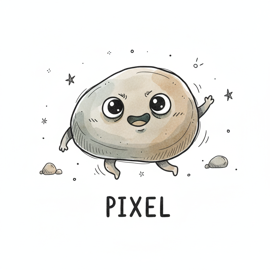 Niedlicher, animierter Kieselstein mit großen Augen und Lächeln, der fröhlich springt. Unten steht 'PIXEL'.