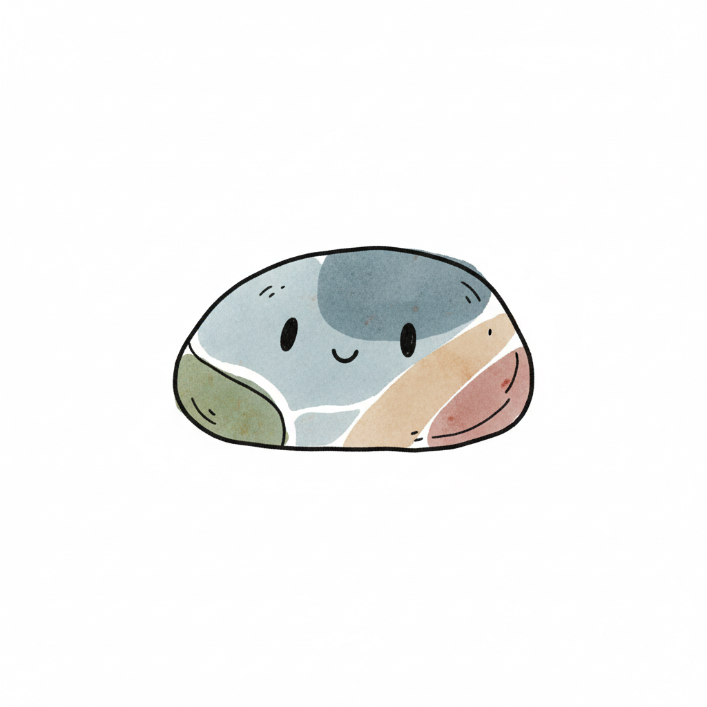 Ein fröhlicher, oranger Blob mit Wangenrot, umgeben von grauen Steinen im Aquarell-Cartoon-Stil.