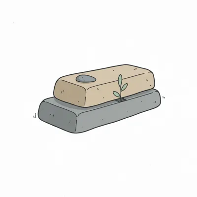 Ein grüner Spross wächst aus einem grauen Block, auf dem ein beiger Block mit Kieselstein liegt.