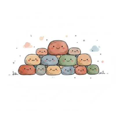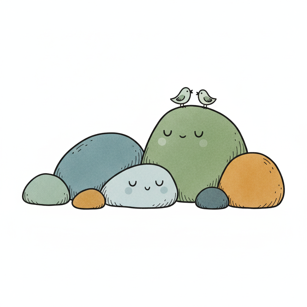 Ein lächelnder Stein mit zwei Vögeln und weiteren Kieselsteinen in einem niedlichen Cartoon-Stil.