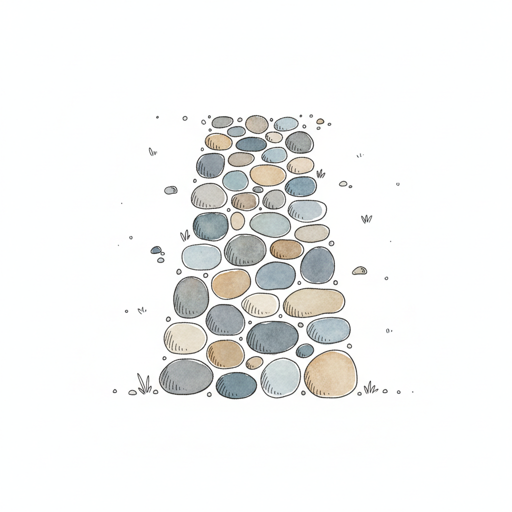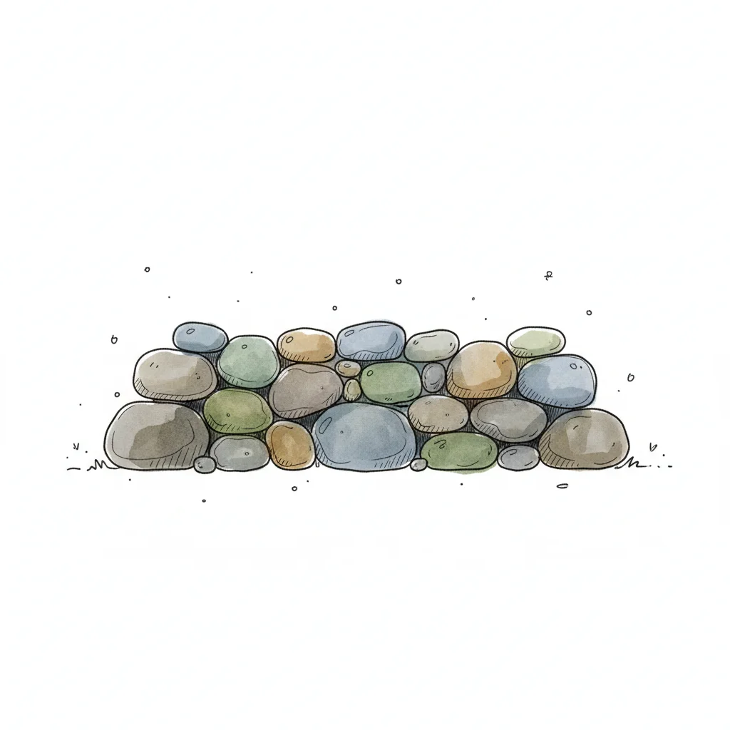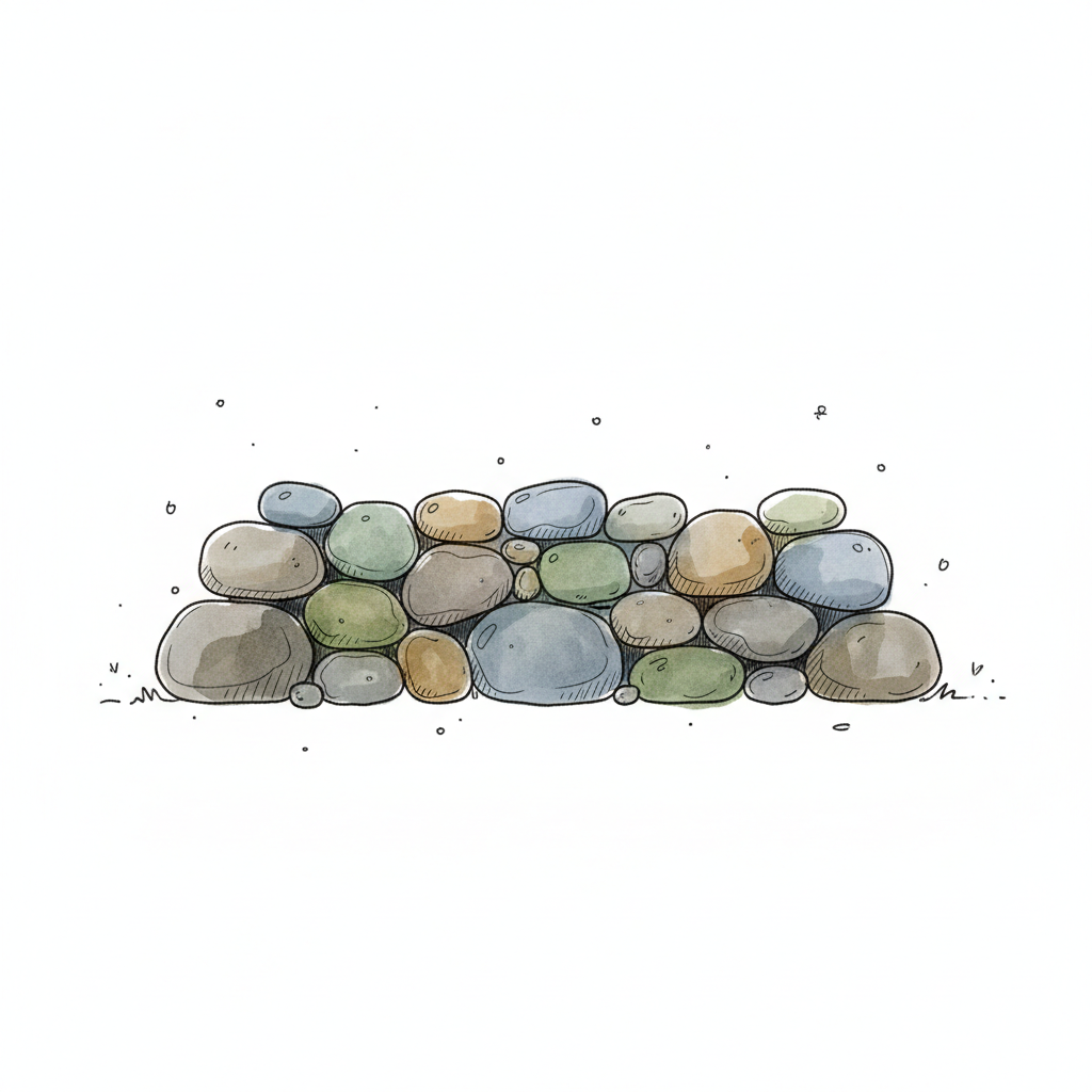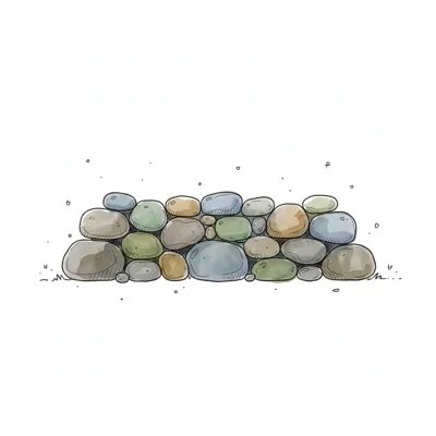 Eine handgezeichnete Aquarell-Illustration einer niedrigen Steinmauer aus runden, bunten Kieselsteinen.